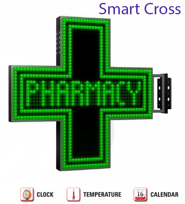 With built-in effects, we can highlight the important content, communicate the information about the opening of your pharmacy 24 hours a day and 7 days a week, and also show a date, time and temperature. In addition, the cross is equipped with a clock, thermometer and calendar, which can be presented alternately with inscriptions in one of the selected languages.